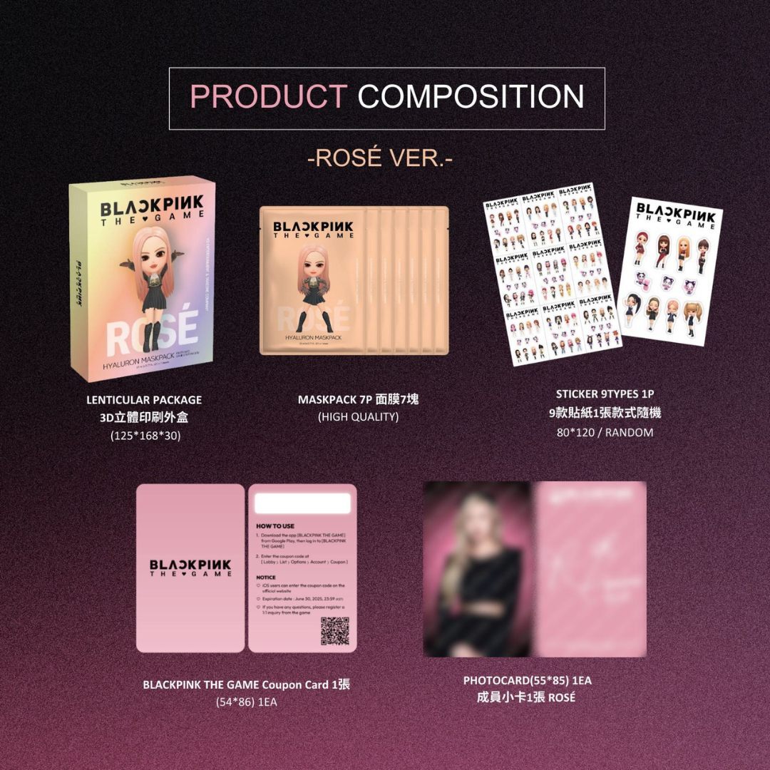 Each box contains MASKPACK 7P, ROSE PHOTOCARD 1P, STICKER 9TYPES 1P(RANDOM), and BLACKPINK THE GAME COUPON CARD 1P(Worth KRW$10,000)